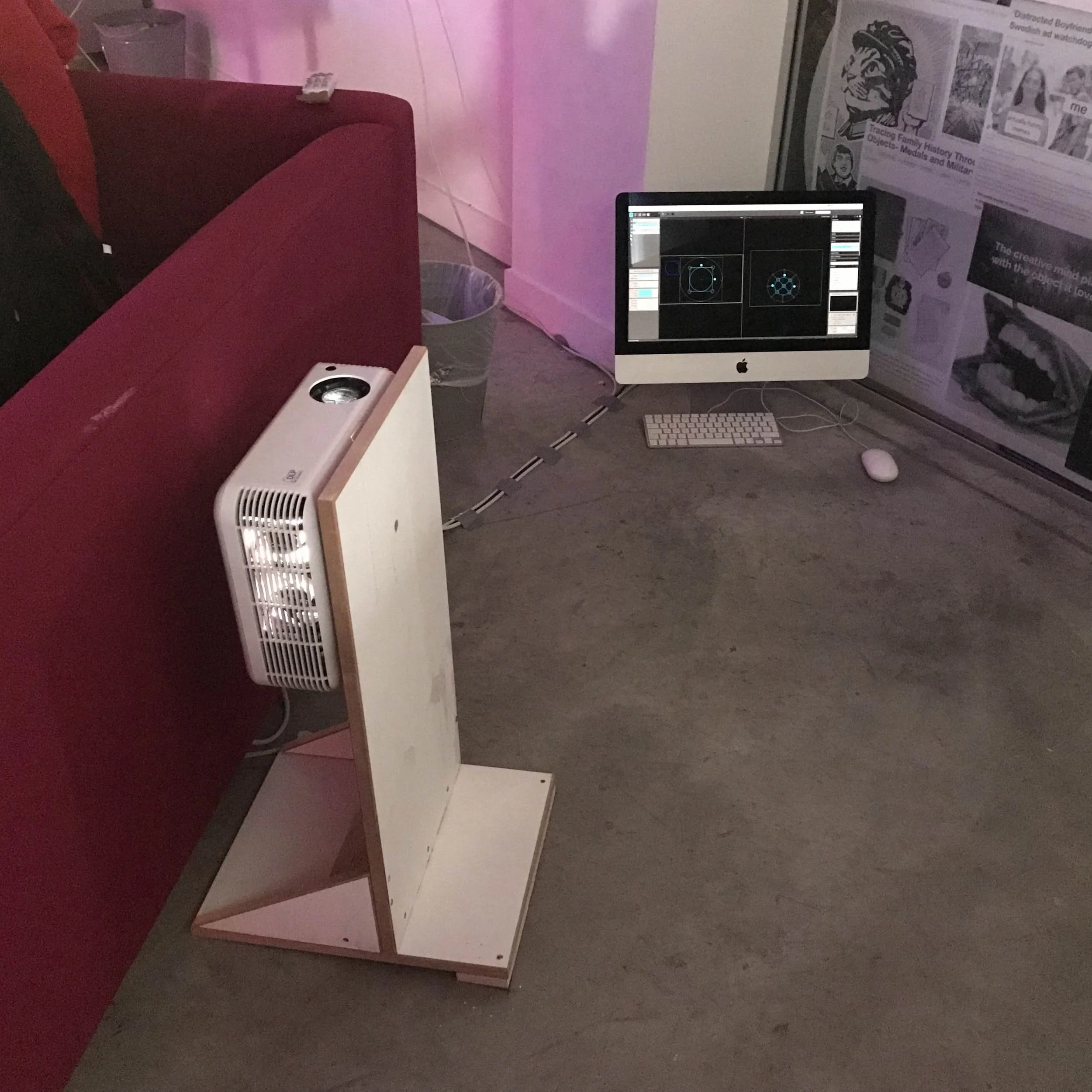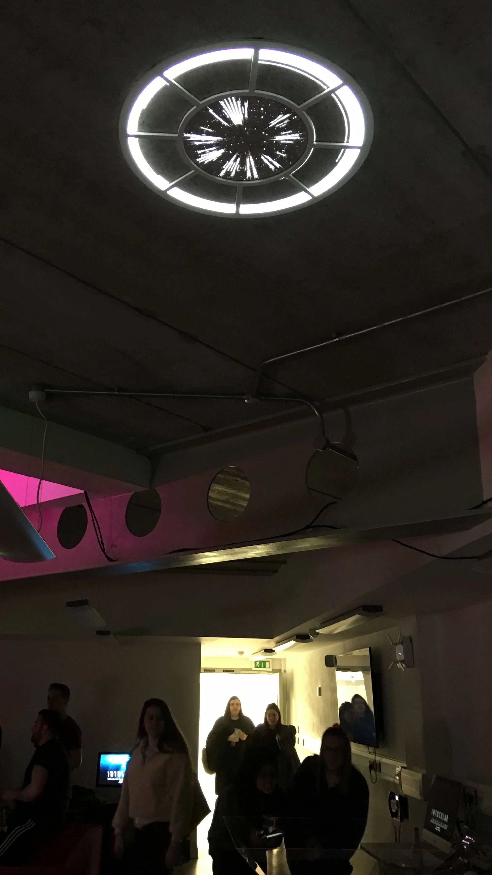 In my first year at the University of Lincoln, I created an audio-reactive stargazing experience. I laser-cut a spacecraft window and attached it to the ceiling directly above a sofa. I then projection-mapped an animation of moving stars and an audio visualiser into the frame that reacted to the noise in the studio. I also placed diffraction glasses on the arm of the sofa to add another dimension to the experience.